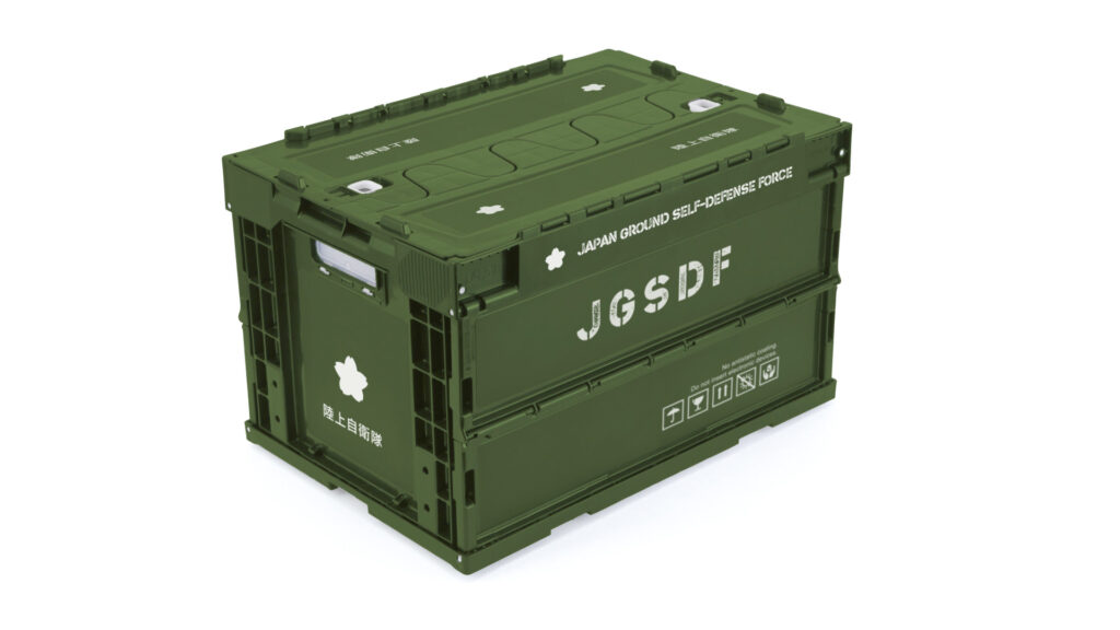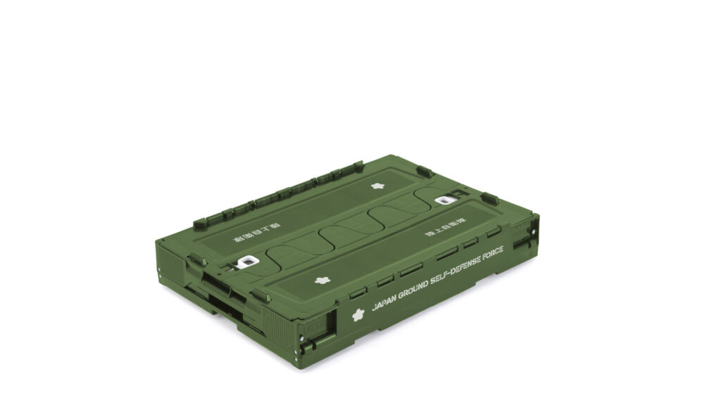 陸上自衛隊をイメージした新色グリーンの折りたたみコンテナが登場!筐体は、実際の物流現場で使用されているオリコンで強度、耐久性ともに折り紙つきです。50.1リットルの大容量ですが、折りたたむと高さ9.5cmと超コンパクトに。 装備品の収納用、レーション保管、書類の保管などに最適です。また、カギやインシュロックを使用することでフタをロックすることもできます。