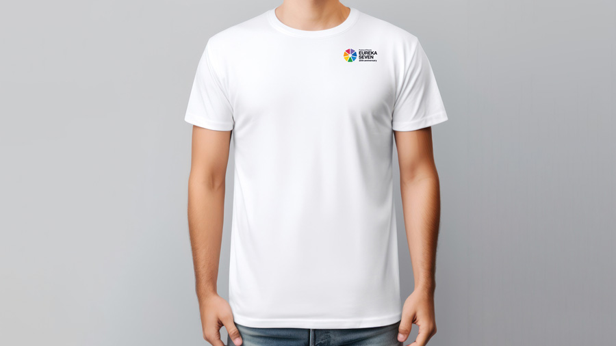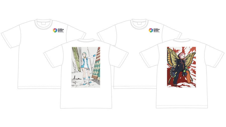 エウレカとアネモネのイラストを使用したバックプリントTシャツです。フロント左胸上部分には20周年ロゴがプリントされています。