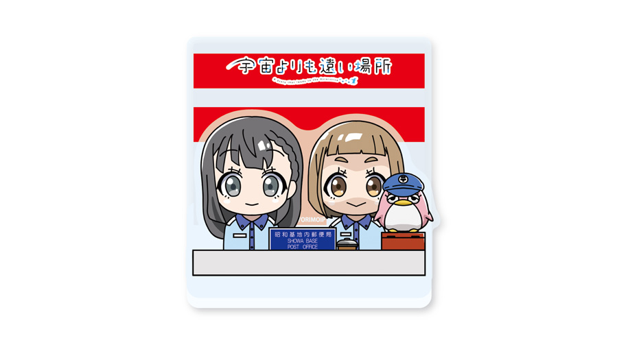 監督 いしづかあつこ、シリーズ構成・脚本 花田十輝、アニメーション製作 MADHOUSEの女子高生南極青春グラフィティ!TVアニメ『宇宙よりも遠い場所』より、「昭和基地内郵便局アクリルスタンド」が登場。第11話にてキマリと結月が郵便局員の格好をしたシーンをデフォルメで描きおこしたアクリルスタンドです。ちょっとしたレターラックにもなります。作画はイザベラが担当しています。