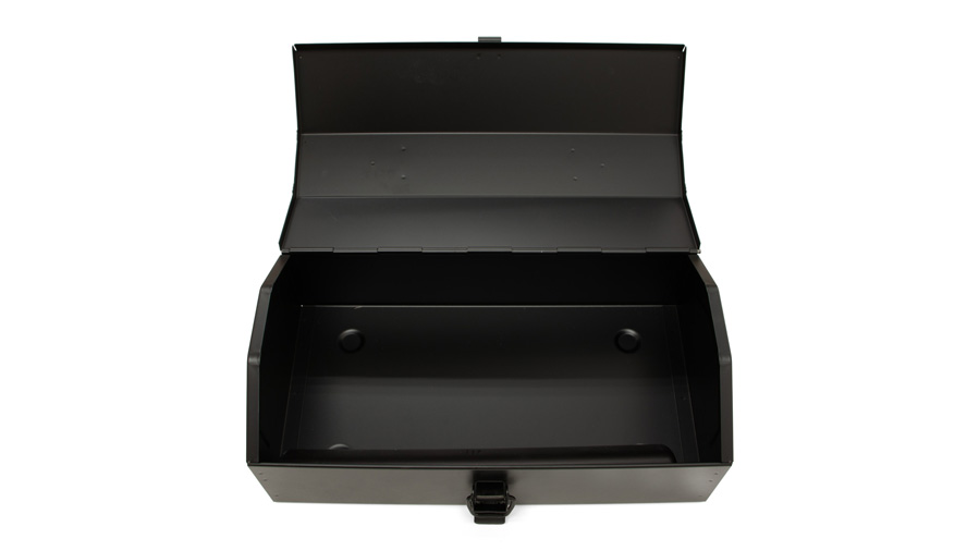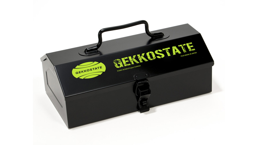 ゲッコーステイトの備品をイメージしたスチール製のツールボックスです。こちらは、大型自動車や建設機械などに付属している山型スチール製ツールボックスをベースに特注色で仕上げました。製造は新潟県三条市にある「日本一のオーダー工具箱屋」として業界では有名な中村精工株式会社。様々な工具箱、道具箱、什器などを製造しているOEMメーカーで、高品質で耐久性の高い製品を供給しています。特注色のブラック塗装は七分ツヤ仕上げで、ミリタリー感を感じさせながらも指紋や汚れがつきにくい実用的な仕様となっています。